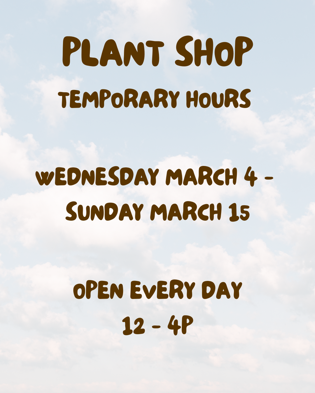 We will be open every day with shortened hours from 12p - 4p, March 4 - March 15, 2026.